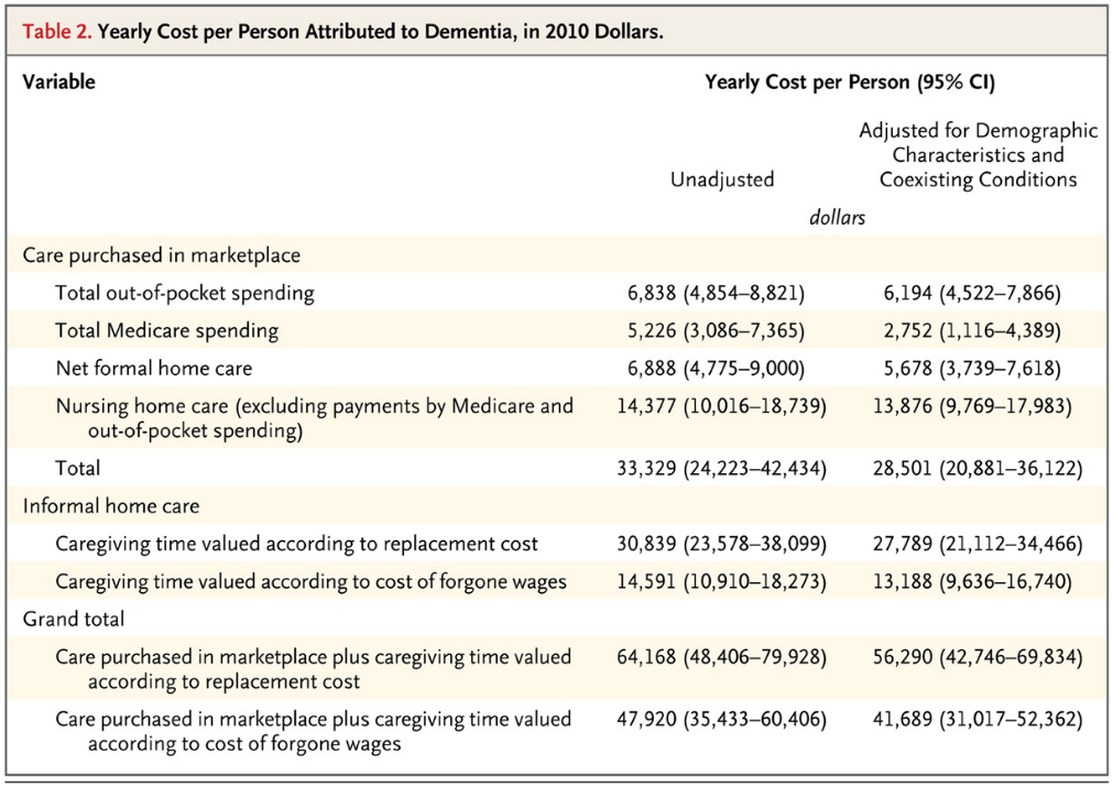 Source: “Monetary Costs of Dementia in the United States”, Hurd, Martorell, Delavande, et al, New England Journal of Medicine 2013:368:1326-1334, April 4 2013, http://www.nejm.org/doi/full/10.1056/NEJMsa1204629